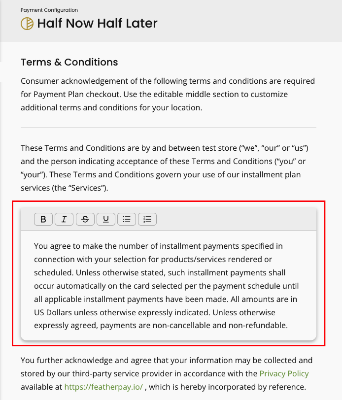 By default, you will be set up with our current Terms & Conditions text for Half Now Half Later and Payment Plans. However, you are able to customize most of the terms, leaving only a small portion that pertains specifically to iCorePay. Follow the steps below to access and edit your terms and conditions.