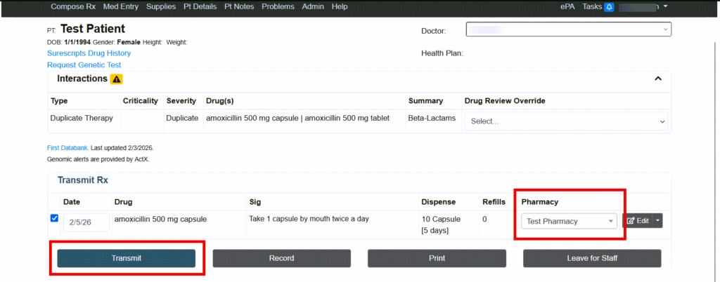 2. On the Transmit page, review any Drug Interactions and Alerts if applicable.