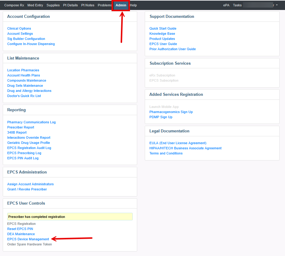 4. Select EPCS Device Management, from the EPCS User Controls section, in the bottom left corner.